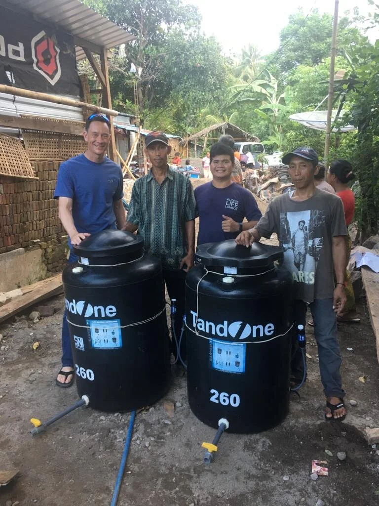 In late 2018, after the earthquakes, our Access Life Lombok Water Team completed a survey of this water project and agreed to work with this community. As they did not have access to another water source, we put forth a proposal to build and install public filtration units. We planned to install them in strategic locations where houses were grouped together. Each unit consists of 3-4 Sawyer water filters installed in a 350-liter water tank. We installed two units in late 2018 as a trial. We agreed to come back and install an additional four units in 2019 if the community actually used these water filter stations.